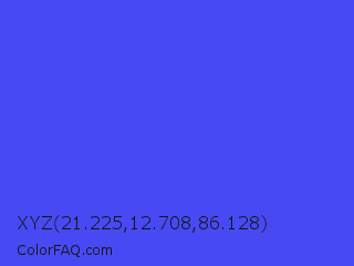 XYZ 21.225,12.708,86.128 Color is a light blue color and the nearest color is Ultramarine Blue #4166f5. Hex code #474af3 and RGB value is rgb(71,74,243). In RGB color space, this color is composed of 28% red, 29% green, 95% blue, In CMYK color space, this color is composed of 71% cyan, 70% magenta, 0% yellow , 5% black , In HSL color space, this color has a hue angle of 239° , 88% saturation and 62% lightness.