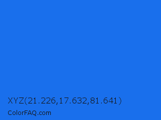 XYZ 21.226,17.632,81.641 Color is a normal blue color and the nearest color is Blue Crayola #1f75fe. Hex code #196fec and RGB value is rgb(25,111,236). In RGB color space, this color is composed of 10% red, 44% green, 93% blue, In CMYK color space, this color is composed of 89% cyan, 53% magenta, 0% yellow , 7% black , In HSL color space, this color has a hue angle of 216° , 85% saturation and 51% lightness.