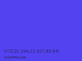 XYZ 21.244,12.027,83.64 Color is a normal indigo color and the nearest color is Majorelle Blue #6050dc. Hex code #5342f0 and RGB value is rgb(83,66,240). In RGB color space, this color is composed of 33% red, 26% green, 94% blue, In CMYK color space, this color is composed of 65% cyan, 73% magenta, 0% yellow , 6% black , In HSL color space, this color has a hue angle of 246° , 85% saturation and 60% lightness.