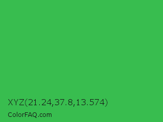 XYZ 21.24,37.8,13.574 Color is a normal green color and the nearest color is Chateau Green #40a860. Hex code #38bd4f and RGB value is rgb(56,189,79). In RGB color space, this color is composed of 22% red, 74% green, 31% blue, In CMYK color space, this color is composed of 70% cyan, 0% magenta, 58% yellow , 26% black , In HSL color space, this color has a hue angle of 130° , 54% saturation and 48% lightness.