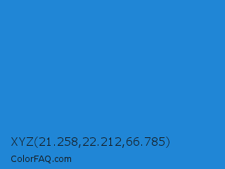 XYZ 21.258,22.212,66.785 Color is a normal blue color and the nearest color is Curious Blue #2596d1. Hex code #2086d6 and RGB value is rgb(32,134,214). In RGB color space, this color is composed of 13% red, 53% green, 84% blue, In CMYK color space, this color is composed of 85% cyan, 37% magenta, 0% yellow , 16% black , In HSL color space, this color has a hue angle of 206° , 74% saturation and 48% lightness.