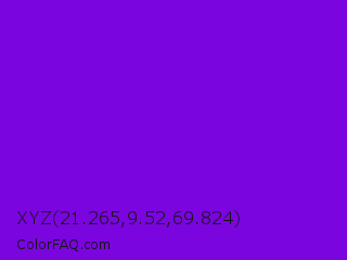 XYZ 21.265,9.52,69.824 Color is a normal purple color and the nearest color is French Violet #8806ce. Hex code #7a05de and RGB value is rgb(122,5,222). In RGB color space, this color is composed of 48% red, 2% green, 87% blue, In CMYK color space, this color is composed of 45% cyan, 98% magenta, 0% yellow , 13% black , In HSL color space, this color has a hue angle of 272° , 96% saturation and 45% lightness.