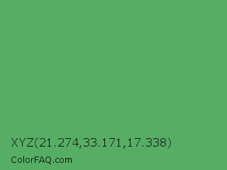 XYZ 21.274,33.171,17.338 Color is a normal green color and the nearest color is Fern #63b76c. Hex code #56ae64 and RGB value is rgb(86,174,100). In RGB color space, this color is composed of 34% red, 68% green, 39% blue, In CMYK color space, this color is composed of 51% cyan, 0% magenta, 43% yellow , 32% black , In HSL color space, this color has a hue angle of 130° , 35% saturation and 51% lightness.