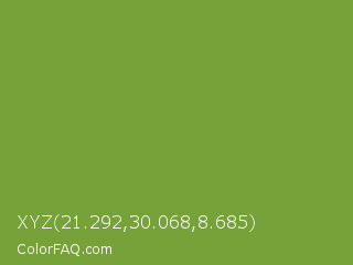 XYZ 21.292,30.068,8.685 Color is a normal green color and the nearest color is Palm Leaf #6f9940. Hex code #77a23a and RGB value is rgb(119,162,58). In RGB color space, this color is composed of 47% red, 64% green, 23% blue, In CMYK color space, this color is composed of 27% cyan, 0% magenta, 64% yellow , 36% black , In HSL color space, this color has a hue angle of 85° , 47% saturation and 43% lightness.