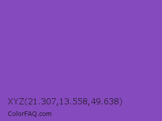 XYZ 21.307,13.558,49.638 Color is a normal purple color and the nearest color is Fuchsia Blue #7a58c1. Hex code #854abd and RGB value is rgb(133,74,189). In RGB color space, this color is composed of 52% red, 29% green, 74% blue, In CMYK color space, this color is composed of 30% cyan, 61% magenta, 0% yellow , 26% black , In HSL color space, this color has a hue angle of 271° , 47% saturation and 52% lightness.