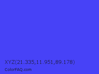 XYZ 21.335,11.951,89.178 Color is a light indigo color and the nearest color is Ultramarine Blue #4166f5. Hex code #4742f7 and RGB value is rgb(71,66,247). In RGB color space, this color is composed of 28% red, 26% green, 97% blue, In CMYK color space, this color is composed of 71% cyan, 73% magenta, 0% yellow , 3% black , In HSL color space, this color has a hue angle of 242° , 92% saturation and 61% lightness.