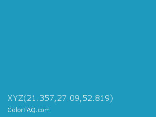 XYZ 21.357,27.09,52.819 Color is a normal cyan color and the nearest color is Eastern Blue #1e9ab0. Hex code #1d9abe and RGB value is rgb(29,154,190). In RGB color space, this color is composed of 11% red, 60% green, 75% blue, In CMYK color space, this color is composed of 85% cyan, 19% magenta, 0% yellow , 25% black , In HSL color space, this color has a hue angle of 193° , 74% saturation and 43% lightness.