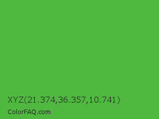 XYZ 21.374,36.357,10.741 Color is a normal green color and the nearest color is Apple #4fa83d. Hex code #50b840 and RGB value is rgb(80,184,64). In RGB color space, this color is composed of 31% red, 72% green, 25% blue, In CMYK color space, this color is composed of 57% cyan, 0% magenta, 65% yellow , 28% black , In HSL color space, this color has a hue angle of 112° , 48% saturation and 49% lightness.