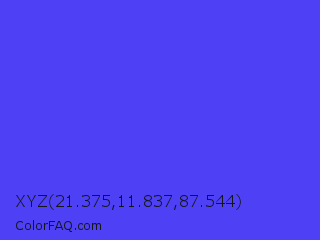XYZ 21.375,11.837,87.544 Color is a light indigo color and the nearest color is Majorelle Blue #6050dc. Hex code #4d40f5 and RGB value is rgb(77,64,245). In RGB color space, this color is composed of 30% red, 25% green, 96% blue, In CMYK color space, this color is composed of 69% cyan, 74% magenta, 0% yellow , 4% black , In HSL color space, this color has a hue angle of 244° , 90% saturation and 61% lightness.