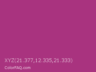 XYZ 21.377,12.335,21.333 Color is a normal magenta color and the nearest color is Maximum Red Purple #a63a79. Hex code #a9337f and RGB value is rgb(169,51,127). In RGB color space, this color is composed of 66% red, 20% green, 50% blue, In CMYK color space, this color is composed of 0% cyan, 70% magenta, 25% yellow , 34% black , In HSL color space, this color has a hue angle of 321° , 54% saturation and 43% lightness.