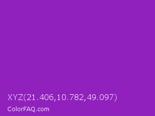 XYZ 21.406,10.782,49.097 Color is a normal purple color and the nearest color is Dark Orchid #9932cc. Hex code #9121bd and RGB value is rgb(145,33,189). In RGB color space, this color is composed of 57% red, 13% green, 74% blue, In CMYK color space, this color is composed of 23% cyan, 83% magenta, 0% yellow , 26% black , In HSL color space, this color has a hue angle of 283° , 70% saturation and 44% lightness.
