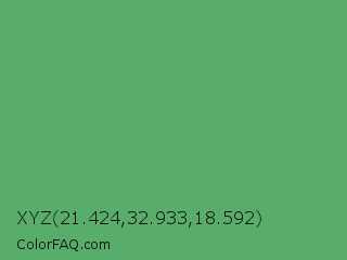 XYZ 21.424,32.933,18.592 Color is a normal green color and the nearest color is Fern #63b76c. Hex code #57ad69 and RGB value is rgb(87,173,105). In RGB color space, this color is composed of 34% red, 68% green, 41% blue, In CMYK color space, this color is composed of 50% cyan, 0% magenta, 39% yellow , 32% black , In HSL color space, this color has a hue angle of 133° , 34% saturation and 51% lightness.