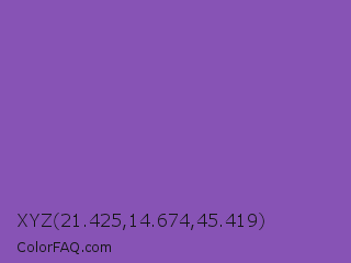 XYZ 21.425,14.674,45.419 Color is a normal purple color and the nearest color is Fuchsia Blue #7a58c1. Hex code #8753b5 and RGB value is rgb(135,83,181). In RGB color space, this color is composed of 53% red, 33% green, 71% blue, In CMYK color space, this color is composed of 25% cyan, 54% magenta, 0% yellow , 29% black , In HSL color space, this color has a hue angle of 272° , 40% saturation and 52% lightness.
