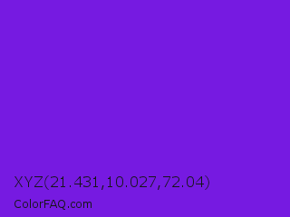 XYZ 21.431,10.027,72.04 Color is a normal violet color and the nearest color is Blue Violet #8a2be2. Hex code #761ae1 and RGB value is rgb(118,26,225). In RGB color space, this color is composed of 46% red, 10% green, 88% blue, In CMYK color space, this color is composed of 48% cyan, 88% magenta, 0% yellow , 12% black , In HSL color space, this color has a hue angle of 268° , 79% saturation and 49% lightness.
