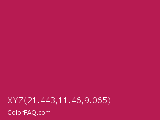 XYZ 21.443,11.46,9.065 Color is a normal rose color and the nearest color is Rose Red #c21e56. Hex code #b71b52 and RGB value is rgb(183,27,82). In RGB color space, this color is composed of 72% red, 11% green, 32% blue, In CMYK color space, this color is composed of 0% cyan, 85% magenta, 55% yellow , 28% black , In HSL color space, this color has a hue angle of 339° , 74% saturation and 41% lightness.