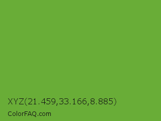 XYZ 21.459,33.166,8.885 Color is a normal green color and the nearest color is Green RYB #66b032. Hex code #69ad37 and RGB value is rgb(105,173,55). In RGB color space, this color is composed of 41% red, 68% green, 22% blue, In CMYK color space, this color is composed of 39% cyan, 0% magenta, 68% yellow , 32% black , In HSL color space, this color has a hue angle of 95° , 52% saturation and 45% lightness.
