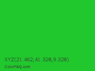 XYZ 21.462,41.328,9.328 Color is a normal green color and the nearest color is Lime Green #32cd32. Hex code #1fc72d and RGB value is rgb(31,199,45). In RGB color space, this color is composed of 12% red, 78% green, 18% blue, In CMYK color space, this color is composed of 84% cyan, 0% magenta, 77% yellow , 22% black , In HSL color space, this color has a hue angle of 125° , 73% saturation and 45% lightness.