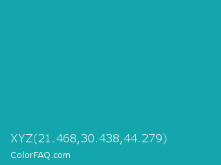 XYZ 21.468,30.438,44.279 Color is a normal cyan color and the nearest color is Eastern Blue #1e9ab0. Hex code #14a6ad and RGB value is rgb(20,166,173). In RGB color space, this color is composed of 8% red, 65% green, 68% blue, In CMYK color space, this color is composed of 88% cyan, 4% magenta, 0% yellow , 32% black , In HSL color space, this color has a hue angle of 183° , 79% saturation and 38% lightness.