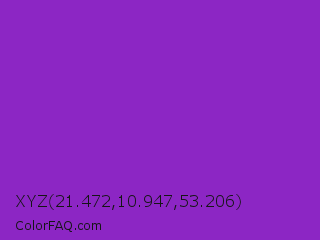 XYZ 21.472,10.947,53.206 Color is a normal purple color and the nearest color is Dark Orchid #9932cc. Hex code #8c26c4 and RGB value is rgb(140,38,196). In RGB color space, this color is composed of 55% red, 15% green, 77% blue, In CMYK color space, this color is composed of 29% cyan, 81% magenta, 0% yellow , 23% black , In HSL color space, this color has a hue angle of 279° , 68% saturation and 46% lightness.
