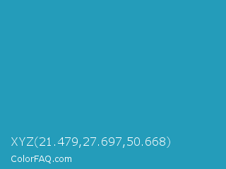 XYZ 21.479,27.697,50.668 Color is a normal cyan color and the nearest color is Eastern Blue #1e9ab0. Hex code #249cba and RGB value is rgb(36,156,186). In RGB color space, this color is composed of 14% red, 61% green, 73% blue, In CMYK color space, this color is composed of 81% cyan, 16% magenta, 0% yellow , 27% black , In HSL color space, this color has a hue angle of 192° , 68% saturation and 44% lightness.