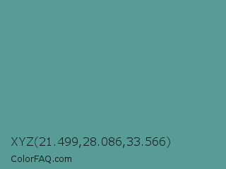 XYZ 21.499,28.086,33.566 Color is a normal cyan color and the nearest color is Polished Pine #5da493. Hex code #589c97 and RGB value is rgb(88,156,151). In RGB color space, this color is composed of 35% red, 61% green, 59% blue, In CMYK color space, this color is composed of 44% cyan, 0% magenta, 3% yellow , 39% black , In HSL color space, this color has a hue angle of 176° , 28% saturation and 48% lightness.
