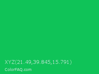 XYZ 21.49,39.845,15.791 Color is a normal green color and the nearest color is Malachite #0bda51. Hex code #10c358 and RGB value is rgb(16,195,88). In RGB color space, this color is composed of 6% red, 76% green, 35% blue, In CMYK color space, this color is composed of 92% cyan, 0% magenta, 55% yellow , 24% black , In HSL color space, this color has a hue angle of 144° , 85% saturation and 41% lightness.