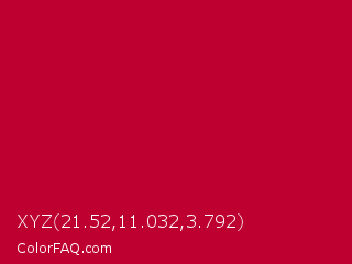 XYZ 21.52,11.032,3.792 Color is a normal red color and the nearest color is Crimson Glory #be0032. Hex code #bd0030 and RGB value is rgb(189,0,48). In RGB color space, this color is composed of 74% red, 0% green, 19% blue, In CMYK color space, this color is composed of 0% cyan, 100% magenta, 75% yellow , 26% black , In HSL color space, this color has a hue angle of 345° , 100% saturation and 37% lightness.