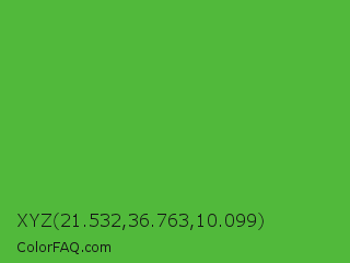 XYZ 21.532,36.763,10.099 Color is a normal green color and the nearest color is Apple #4fa83d. Hex code #51b93b and RGB value is rgb(81,185,59). In RGB color space, this color is composed of 32% red, 73% green, 23% blue, In CMYK color space, this color is composed of 56% cyan, 0% magenta, 68% yellow , 27% black , In HSL color space, this color has a hue angle of 110° , 52% saturation and 48% lightness.