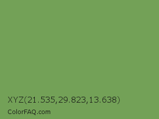 XYZ 21.535,29.823,13.638 Color is a normal green color and the nearest color is Asparagus Green #7ba05b. Hex code #73a157 and RGB value is rgb(115,161,87). In RGB color space, this color is composed of 45% red, 63% green, 34% blue, In CMYK color space, this color is composed of 29% cyan, 0% magenta, 46% yellow , 37% black , In HSL color space, this color has a hue angle of 97° , 30% saturation and 49% lightness.