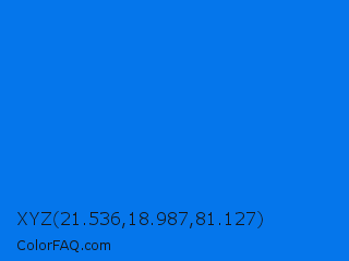 XYZ 21.536,18.987,81.127 Color is a normal blue color and the nearest color is Brandeis Blue #0070ff. Hex code #0576eb and RGB value is rgb(5,118,235). In RGB color space, this color is composed of 2% red, 46% green, 92% blue, In CMYK color space, this color is composed of 98% cyan, 50% magenta, 0% yellow , 8% black , In HSL color space, this color has a hue angle of 211° , 96% saturation and 47% lightness.