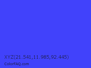 XYZ 21.541,11.985,92.445 Color is a light blue color and the nearest color is Ultramarine Blue #4166f5. Hex code #4142fb and RGB value is rgb(65,66,251). In RGB color space, this color is composed of 25% red, 26% green, 98% blue, In CMYK color space, this color is composed of 74% cyan, 74% magenta, 0% yellow , 2% black , In HSL color space, this color has a hue angle of 240° , 96% saturation and 62% lightness.