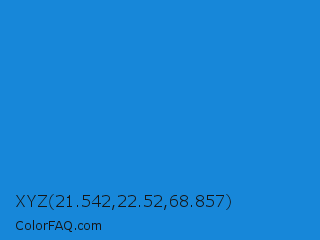 XYZ 21.542,22.52,68.857 Color is a normal blue color and the nearest color is Bright Navy Blue #1974d2. Hex code #1787d9 and RGB value is rgb(23,135,217). In RGB color space, this color is composed of 9% red, 53% green, 85% blue, In CMYK color space, this color is composed of 89% cyan, 38% magenta, 0% yellow , 15% black , In HSL color space, this color has a hue angle of 205° , 81% saturation and 47% lightness.