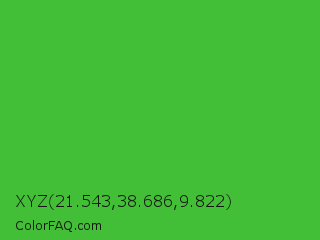 XYZ 21.543,38.686,9.822 Color is a normal green color and the nearest color is Wageningen Green #34b233. Hex code #42bf36 and RGB value is rgb(66,191,54). In RGB color space, this color is composed of 26% red, 75% green, 21% blue, In CMYK color space, this color is composed of 65% cyan, 0% magenta, 72% yellow , 25% black , In HSL color space, this color has a hue angle of 115° , 56% saturation and 48% lightness.