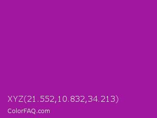 XYZ 21.552,10.832,34.213 Color is a normal magenta color and the nearest color is Violet Eggplant #991199. Hex code #a217a0 and RGB value is rgb(162,23,160). In RGB color space, this color is composed of 64% red, 9% green, 63% blue, In CMYK color space, this color is composed of 0% cyan, 86% magenta, 1% yellow , 36% black , In HSL color space, this color has a hue angle of 301° , 75% saturation and 36% lightness.
