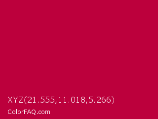 XYZ 21.555,11.018,5.266 Color is a normal rose color and the nearest color is Crimson Glory #be0032. Hex code #bc003c and RGB value is rgb(188,0,60). In RGB color space, this color is composed of 74% red, 0% green, 24% blue, In CMYK color space, this color is composed of 0% cyan, 100% magenta, 68% yellow , 26% black , In HSL color space, this color has a hue angle of 341° , 100% saturation and 37% lightness.