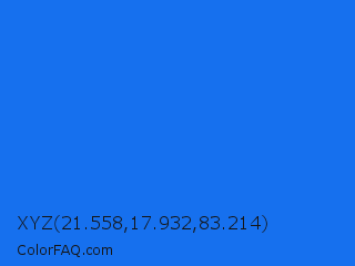 XYZ 21.558,17.932,83.214 Color is a normal blue color and the nearest color is Blue Crayola #1f75fe. Hex code #1670ee and RGB value is rgb(22,112,238). In RGB color space, this color is composed of 9% red, 44% green, 93% blue, In CMYK color space, this color is composed of 91% cyan, 53% magenta, 0% yellow , 7% black , In HSL color space, this color has a hue angle of 215° , 86% saturation and 51% lightness.