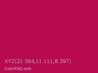 XYZ 21.564,11.111,8.597 Color is a normal rose color and the nearest color is Pictorial Carmine #c30b4e. Hex code #b90a50 and RGB value is rgb(185,10,80). In RGB color space, this color is composed of 73% red, 4% green, 31% blue, In CMYK color space, this color is composed of 0% cyan, 95% magenta, 57% yellow , 27% black , In HSL color space, this color has a hue angle of 336° , 90% saturation and 38% lightness.