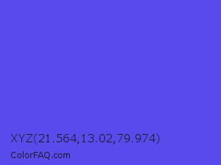 XYZ 21.564,13.02,79.974 Color is a light indigo color and the nearest color is Majorelle Blue #6050dc. Hex code #594aeb and RGB value is rgb(89,74,235). In RGB color space, this color is composed of 35% red, 29% green, 92% blue, In CMYK color space, this color is composed of 62% cyan, 69% magenta, 0% yellow , 8% black , In HSL color space, this color has a hue angle of 246° , 80% saturation and 61% lightness.