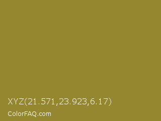 XYZ 21.571,23.923,6.17 Color is a normal yellow color and the nearest color is Sycamore #908d39. Hex code #95872f and RGB value is rgb(149,135,47). In RGB color space, this color is composed of 58% red, 53% green, 18% blue, In CMYK color space, this color is composed of 0% cyan, 9% magenta, 68% yellow , 42% black , In HSL color space, this color has a hue angle of 52° , 52% saturation and 38% lightness.