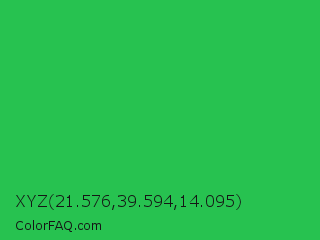 XYZ 21.576,39.594,14.095 Color is a normal green color and the nearest color is Lime Green #32cd32. Hex code #27c250 and RGB value is rgb(39,194,80). In RGB color space, this color is composed of 15% red, 76% green, 31% blue, In CMYK color space, this color is composed of 80% cyan, 0% magenta, 59% yellow , 24% black , In HSL color space, this color has a hue angle of 136° , 67% saturation and 46% lightness.