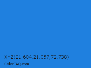 XYZ 21.604,21.057,72.738 Color is a normal blue color and the nearest color is Bright Navy Blue #1974d2. Hex code #1f80df and RGB value is rgb(31,128,223). In RGB color space, this color is composed of 12% red, 50% green, 87% blue, In CMYK color space, this color is composed of 86% cyan, 43% magenta, 0% yellow , 13% black , In HSL color space, this color has a hue angle of 210° , 76% saturation and 50% lightness.
