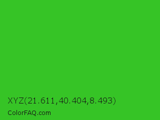XYZ 21.611,40.404,8.493 Color is a normal green color and the nearest color is Lime Green #32cd32. Hex code #36c426 and RGB value is rgb(54,196,38). In RGB color space, this color is composed of 21% red, 77% green, 15% blue, In CMYK color space, this color is composed of 72% cyan, 0% magenta, 81% yellow , 23% black , In HSL color space, this color has a hue angle of 114° , 68% saturation and 46% lightness.