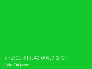 XYZ 21.611,42.096,9.272 Color is a normal green color and the nearest color is Vivid Malachite #00cc33. Hex code #14c92b and RGB value is rgb(20,201,43). In RGB color space, this color is composed of 8% red, 79% green, 17% blue, In CMYK color space, this color is composed of 90% cyan, 0% magenta, 79% yellow , 21% black , In HSL color space, this color has a hue angle of 128° , 82% saturation and 43% lightness.