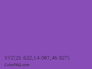 XYZ 21.622,14.087,46.927 Color is a normal purple color and the nearest color is Deep Lilac #9955bb. Hex code #894db8 and RGB value is rgb(137,77,184). In RGB color space, this color is composed of 54% red, 30% green, 72% blue, In CMYK color space, this color is composed of 26% cyan, 58% magenta, 0% yellow , 28% black , In HSL color space, this color has a hue angle of 274° , 43% saturation and 51% lightness.