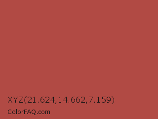 XYZ 21.624,14.662,7.159 Color is a normal red color and the nearest color is Apple Blossom #af4d43. Hex code #b14a44 and RGB value is rgb(177,74,68). In RGB color space, this color is composed of 69% red, 29% green, 27% blue, In CMYK color space, this color is composed of 0% cyan, 58% magenta, 62% yellow , 31% black , In HSL color space, this color has a hue angle of 3° , 44% saturation and 48% lightness.