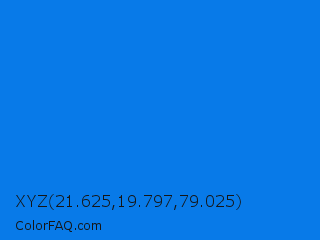 XYZ 21.625,19.797,79.025 Color is a normal blue color and the nearest color is Azure Radiance #007fff. Hex code #087ae8 and RGB value is rgb(8,122,232). In RGB color space, this color is composed of 3% red, 48% green, 91% blue, In CMYK color space, this color is composed of 97% cyan, 47% magenta, 0% yellow , 9% black , In HSL color space, this color has a hue angle of 209° , 93% saturation and 47% lightness.