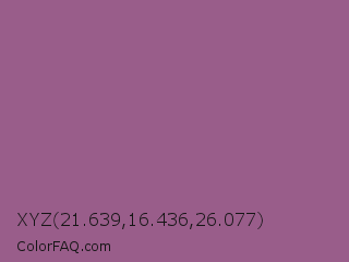 XYZ 21.639,16.436,26.077 Color is a normal magenta color and the nearest color is Strikemaster #956387. Hex code #995d8a and RGB value is rgb(153,93,138). In RGB color space, this color is composed of 60% red, 36% green, 54% blue, In CMYK color space, this color is composed of 0% cyan, 39% magenta, 10% yellow , 40% black , In HSL color space, this color has a hue angle of 315° , 24% saturation and 48% lightness.