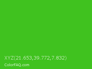 XYZ 21.653,39.772,7.832 Color is a normal green color and the nearest color is Harlequin Green #46cb18. Hex code #40c21f and RGB value is rgb(64,194,31). In RGB color space, this color is composed of 25% red, 76% green, 12% blue, In CMYK color space, this color is composed of 67% cyan, 0% magenta, 84% yellow , 24% black , In HSL color space, this color has a hue angle of 108° , 72% saturation and 44% lightness.