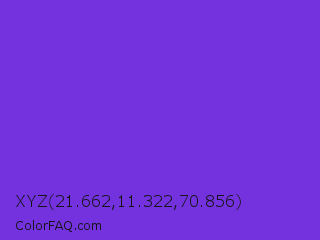 XYZ 21.662,11.322,70.856 Color is a normal violet color and the nearest color is Blue Violet #8a2be2. Hex code #7432df and RGB value is rgb(116,50,223). In RGB color space, this color is composed of 45% red, 20% green, 87% blue, In CMYK color space, this color is composed of 48% cyan, 78% magenta, 0% yellow , 13% black , In HSL color space, this color has a hue angle of 263° , 73% saturation and 54% lightness.