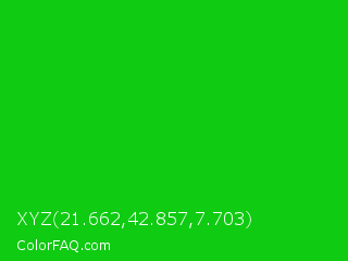 XYZ 21.662,42.857,7.703 Color is a normal green color and the nearest color is Vivid Malachite #00cc33. Hex code #0fcb12 and RGB value is rgb(15,203,18). In RGB color space, this color is composed of 6% red, 80% green, 7% blue, In CMYK color space, this color is composed of 93% cyan, 0% magenta, 91% yellow , 20% black , In HSL color space, this color has a hue angle of 121° , 86% saturation and 43% lightness.